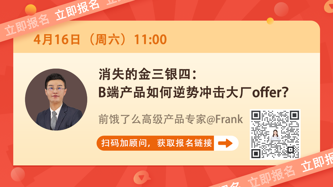 4月16日(周六)上午11点,前饿了么高级产品专家@Frank老师,1小时直播分享,是否要进大厂,并现场拆解大厂B端产品经理核心能力要求,手把手教你如何快速积累B端产品能力,并知道进入大厂做B端产品经理该如何准备!