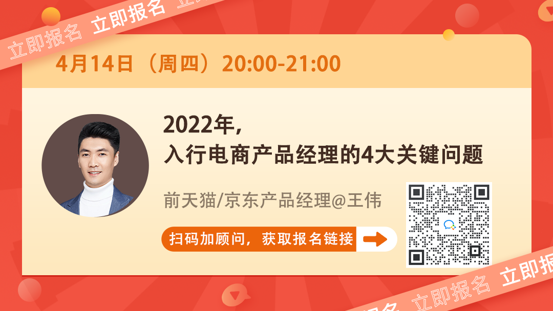 4月14日(周四)晚8点,前天猫/京东产品经理@王伟 老师,带你剖析电商产品经理的发展前景与工作要点,支招提升电商产品能力,助你高效系统入门电商产品经理!