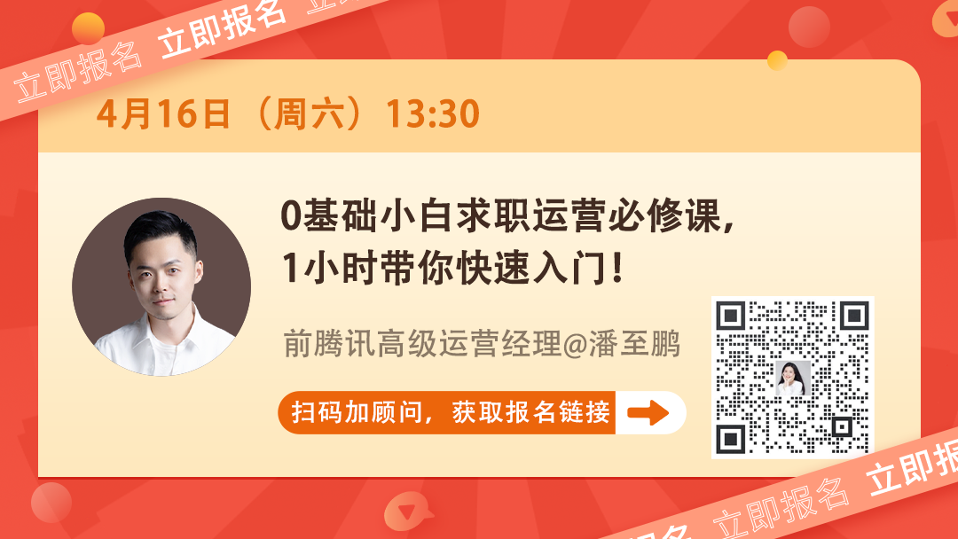 4月16日(周六)13:30,前腾讯高级运营经理@潘至鹏老师,为广大想入门运营的小白,开展一期免费公开课,在线直播讲解少走弯路、快速入门的方法!