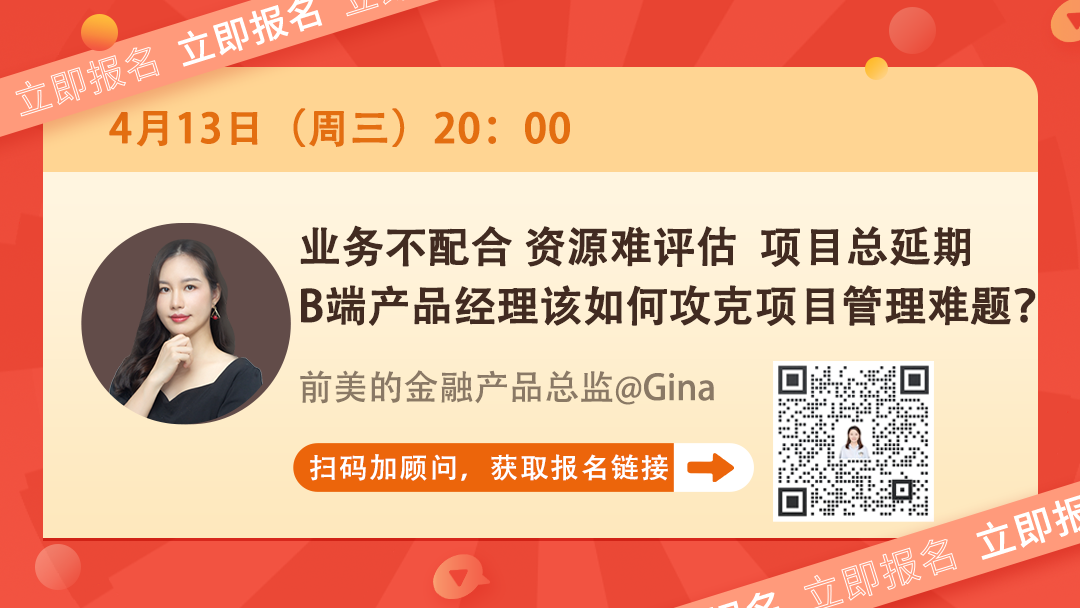 4月13日(下周三),前美的金融产品总监@Gina老师将分享她的实战经验,教你一套实用的项目管理方法~~