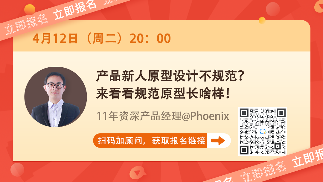 4月12日(下周二)晚8点,11年资深产品经理@Phoenix 将以实例演示的方式,详解产品原型的设计规范与布局要点!还有机会免费领38+实用原型资料!
