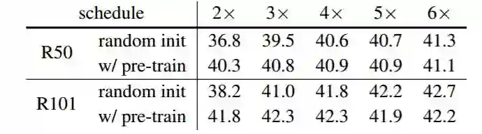 典型的微调方案(2x)结合预训练模型可以很好地收敛到近最优结果(参见表 1,「w/ pre-train」)。但是这样的迭代次数对于从零开始训练的模型并不足够。