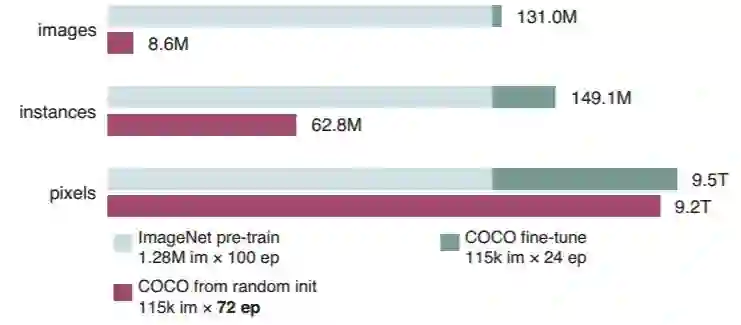 图 2:在所有训练迭代中模型所见到的图像、实例和像素数量,预训练(灰色)+微调(绿色)vs 随机初始化(紫色)。其中,紫色条带普遍比绿色条带更长,意味着需要更大的迭代次数才能收敛。