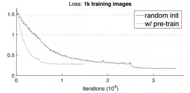 典型的 ImageNet 预训练涉及超过一百万张图像并迭代上百个 epoch。除了从这个大规模数据集中学习到的语义信息以外,预训练模型还学习到了在微调过程中不需要再学习的低级特征(例如,边缘、纹理等)。另一方面,从零开始训练模型时需要同时学习低级和高级特征,因此需要更多的迭代次数才能收敛。