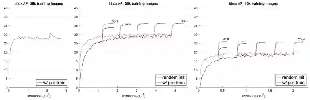 在很多情况下,从头开始训练不会比 ImageNet 预训练差多少,且训练样本数最少可达 10k COCO 图像。