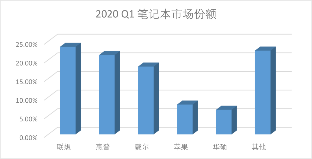 众所周知,目前笔记本电脑的市场格局已经是一个稳定的市场,主要是由联想、惠普、华硕、戴尔、苹果等目前全球的几大厂商稳居第一梯队占领着主导位置,小米、华为、宏基等则位于第二梯队。从 2020 年 Q1 全球市场份额分析中,联想(美帝良心)占据主导地位。其次则为惠普、戴尔、华硕等品牌。