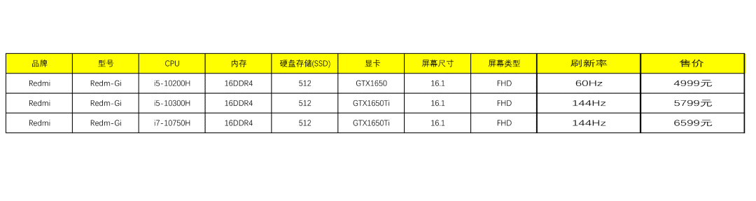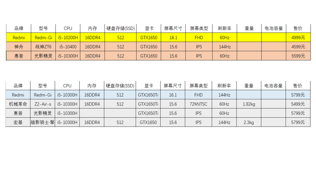 考虑完上面的问题,我们来具体分析一下,Redmi G 游戏本称得上为一款合格的游戏本系列的产品吗?走的是低价位入门版的游戏本。目前推出的三款配置如图所示,均是采用的 1650Ti 的显卡,我在某东上搜到与这款价位差不多,或同款配置的作为对照的参考目标。