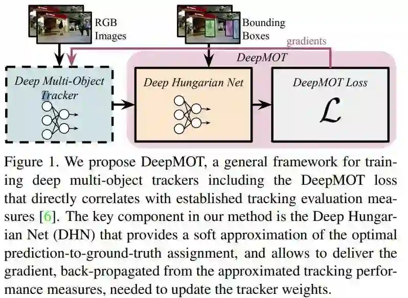 基于视觉的多目标跟踪(MOT)的最新趋势是利用深度学习的代表性力量来联合学习检测和跟踪目标。然而,现有的方法只使用损失函数训练某些子模块,而这些函数往往与建立的跟踪评估措施(如多目标跟踪精度(MOTA)和精度(MOTP))无关。由于这些措施不可微,如何选择合适的损失函数用于多目标跟踪方法的端到端训练仍然是一个有待研究的问题。在本文中,我们通过提出MOTA和MOTP的可微代理来弥补这一差距,我们将其合并为一个适合于深度多目标跟踪器端到端训练的损失函数。作为一个关键的组成部分,我们提出了一个DeepHungarian Net(DHN)模块,它近似Hungarian匹配算法。DHN允许估计目标轨迹和地面真值对象之间的对应关系,计算MOTA和MOTP的可微分代理,进而直接用于优化深度跟踪器。实验证明,所提出的可微框架改善了现有多目标跟踪器的性能,并在MOTChallenge基准测试上建立了一种新的技术。