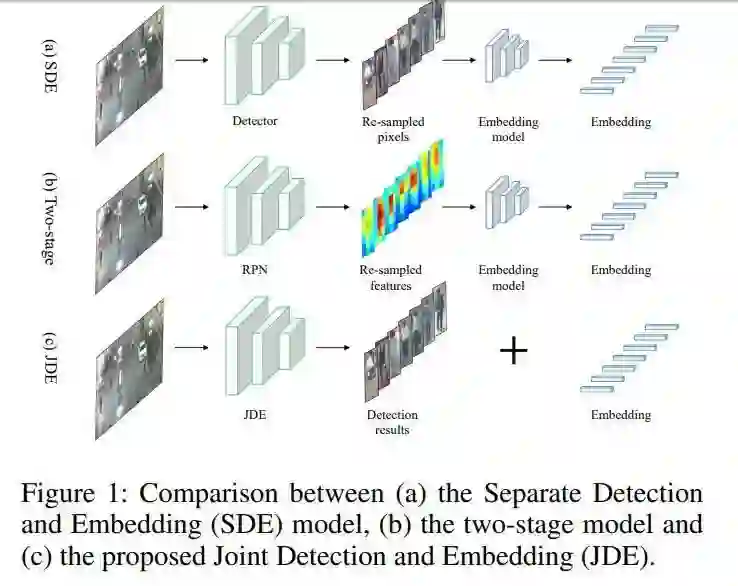现在多目标跟踪系统通常采用检测跟踪的模式。1)目标定位的检测模型,2)数据关联的外观嵌入模型。单独执行两个模型可能会导致效率问题,因为运行时间只是两个步骤的总和,而没有研究它们之间可以共享的潜在结构。现有的实时MOT研究多集中在关联步骤上,本质上是实时关联方法,而不是实时MOT系统。