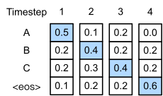 很明显,这样做将原来指数级别的求解空间直接压缩到了与长度线性相关的大小。由于丢弃了绝大多数的可能解,这种关注当下的策略无法保证最终得到的序列概率是最优的。