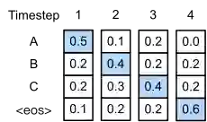 最容易想到的策略是贪心搜索,即每一个时间步都取出一个条件概率最大的输出,再将从开始到当前步的结果作为输入去获得下一个时间步的输出,直到模型给出生成结束的标志。例如下图,每一个时间步都取出了条件概率最大一个结果,生成了序列[A,B,C]。
