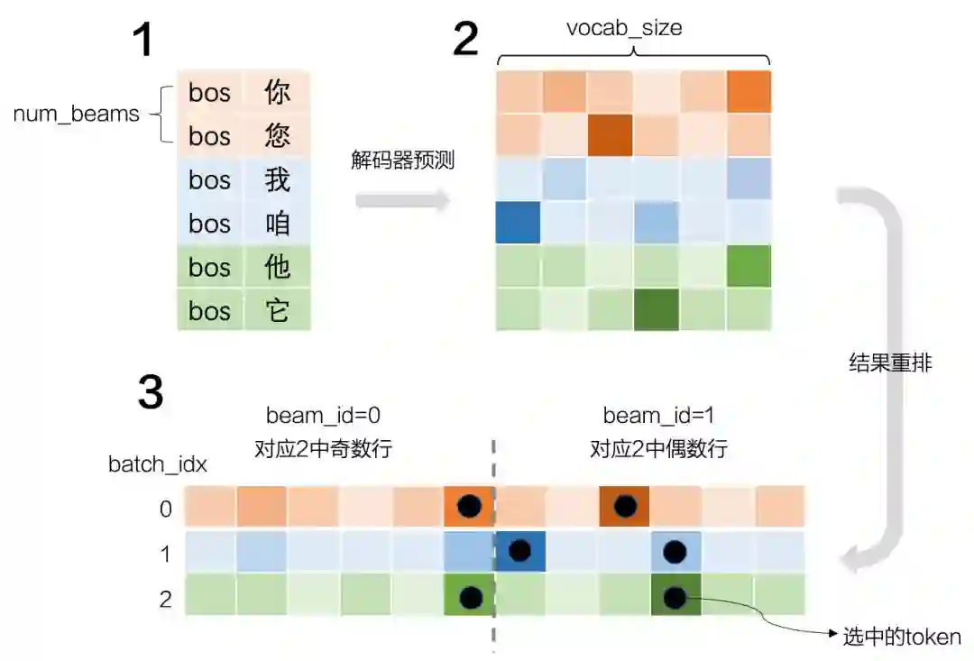 序列扩展是beam search的核心过程,我们特地画了一张图来解释这个版本的实现策略。