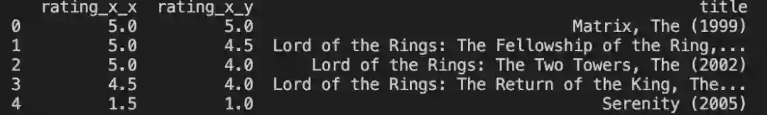 def get_user_similar_movies( user1, user2 ):common_movies = Rating_avg[Rating_avg.userId == user1].merge(Rating_avg[Rating_avg.userId == user2],on = "movieId",how = "inner" )return common_movies.merge( movies, on = 'movieId' )a = get_user_similar_movies(370,86309)a = a.loc[ : , ['rating_x_x','rating_x_y','title']]print(a.head())
