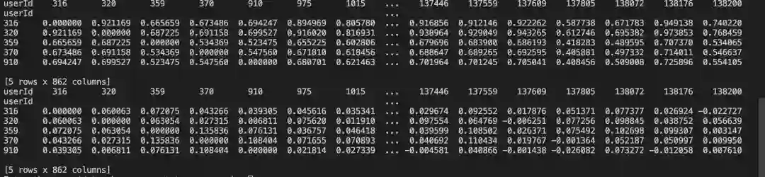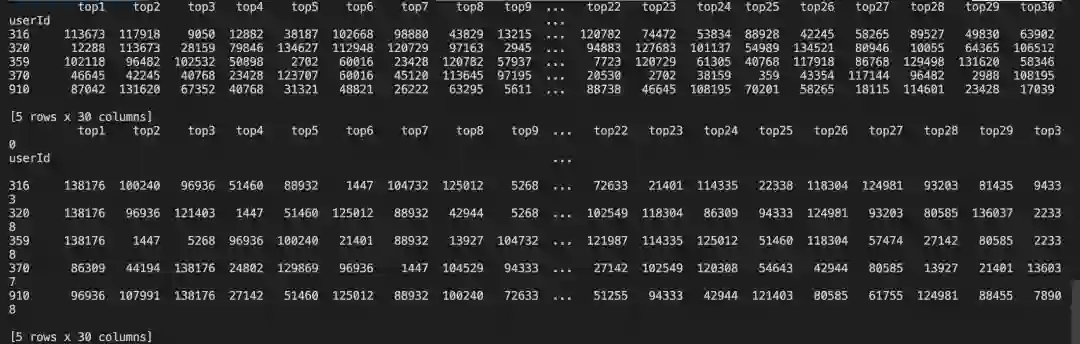 def find_n_neighbours(df,n):order = np.argsort(df.values, axis=1)[:, :n]df = df.apply(lambda x: pd.Series(x.sort_values(ascending=False).iloc[:n].index,index=['top{}'.format(i) for i in range(1, n+1)]), axis=1)return df# top 30 neighbours for each usersim_user_30_u = find_n_neighbours(similarity_with_user,30)print(sim_user_30_u.head())sim_user_30_m = find_n_neighbours(similarity_with_movie,30)print(sim_user_30_m.head())