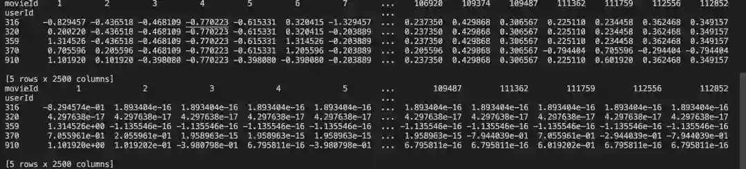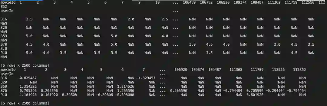 check = pd.pivot_table(Rating_avg,values='rating_x',index='userId',columns='movieId')print(check.head())final = pd.pivot_table(Rating_avg,values='adg_rating',index='userId',columns='movieId')print(final.head())