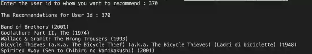 Rating_avg = Rating_avg.astype({"movieId": str})Movie_user = Rating_avg.groupby(by = 'userId')['movieId'].apply(lambda x:','.join(x))def User_item_score1(user):Movie_seen_by_user = check.columns[check[check.index==user].notna().any()].tolist()a = sim_user_30_m[sim_user_30_m.index==user].valuesb = a.squeeze().tolist()d = Movie_user[Movie_user.index.isin(b)]l = ','.join(d.values)Movie_seen_by_similar_users = l.split(',')Movies_under_consideration = list(set(Movie_seen_by_similar_users)-set(list(map(str, Movie_seen_by_user))))Movies_under_consideration = list(map(int, Movies_under_consideration))score = []for item in Movies_under_consideration:c = final_movie.loc[:,item]d = c[c.index.isin(b)]f = d[d.notnull()]avg_user = Mean.loc[Mean['userId'] == user,'rating'].values[0]index = f.index.values.squeeze().tolist()corr = similarity_with_movie.loc[user,index]fin = pd.concat([f, corr], axis=1)fin.columns = ['adg_score','correlation']fin['score']=fin.apply(lambda x:x['adg_score'] * x['correlation'],axis=1)nume = fin['score'].sum()deno = fin['correlation'].sum()final_score = avg_user + (nume/deno)score.append(final_score)data = pd.DataFrame({'movieId':Movies_under_consideration,'score':score})top_5_recommendation = data.sort_values(by='score',ascending=False).head(5)Movie_Name = top_5_recommendation.merge(movies, how='inner', on='movieId')Movie_Names = Movie_Name.title.values.tolist()return Movie_Namesuser = int(input("Enter the user id to whom you want to recommend : "))predicted_movies = User_item_score1(user)print(" ")print("The Recommendations for User Id : 370")print(" ")for i in predicted_movies:print(i)