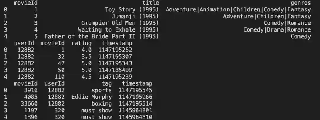 print(movies.head())print(Ratings.head())print(Tags.head())
