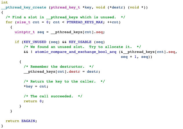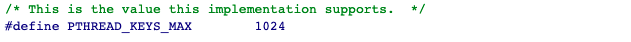 然后检查了代码,看看发生了什么,以及PTHREAD_KEYS_MAX最大值是多少: