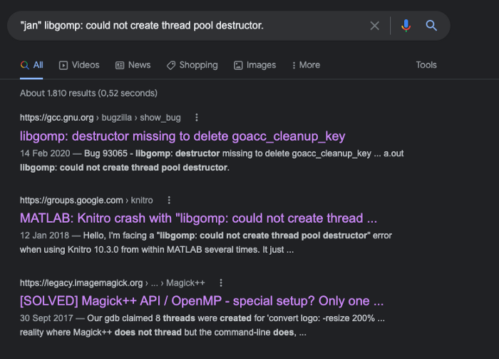 libgomp是什么?我们先上网查了一下这个错误。ServerFault上有人问过这个问题,但没人回答,至少没有我们能用的东西。不过这个问题有点奇怪,因为提问者说他的服务器每隔24~36小时就会发生一次。