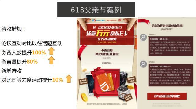 最后我们父亲节做了一个“爸,我这次为你任性了,送您万元京东E卡”的活动。首先,我们抱了“京东6·18”的大腿,他铺天盖地的广告,我们就告诉用户可以免费拿京东E卡还能享受京东的大优惠!那传递给用户的投资场景是什么呢,你获得京东E卡可以为您的父亲买礼物,对于不善言爱的中国人,把爱放在礼物里来表达最好不过了。再加上论坛话题互动“父亲为我做过最感动的事情”,让用户抒发自己对父亲的情感,对活动参与再做一层引导。整个活动就是让用户感觉他是在做一件送礼物给爸爸的事情,而且不用花钱就能享受京东大促。触达给用户的利益点越多,越能打动用户。