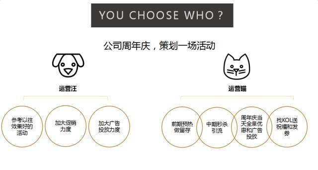 假如你是一家公司的老板,公司要举办周年庆,运营汪跟运营喵分别提供了他们的方案,你会选哪一个呢?