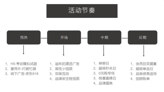 京东618也是有预热、开场、中期、后期。预热会有小小的广告片等等动作,开场的时候也是做遍地的渠道广告,相信没有人没看过京东618的广告。中期的时候他也是有送券、秒杀,通过这些点去刺激用户,后期的时候做返场活动的美好等,当然其中有很多没有提到的点。可是按照活动节奏来说,无论是大的电商平台还是小的平台的活动,套路都是差不多的,只是根据自己平台的一些特性去增加东西。