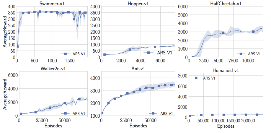 我的学生Aurelia Guy和Horia Mania对此进行了测试,他们编写了一个非常简单的随机搜索版本(是我之前发布的Iqrpols.py中的一个)。令人惊讶的是,这个简单的算法学习了Swimmer-v1,Hopper-v1,Walker2d-v1和Ant-v1任务中的线性策略,这些策略实现了之前文章中提出的奖励阈值。不错!
