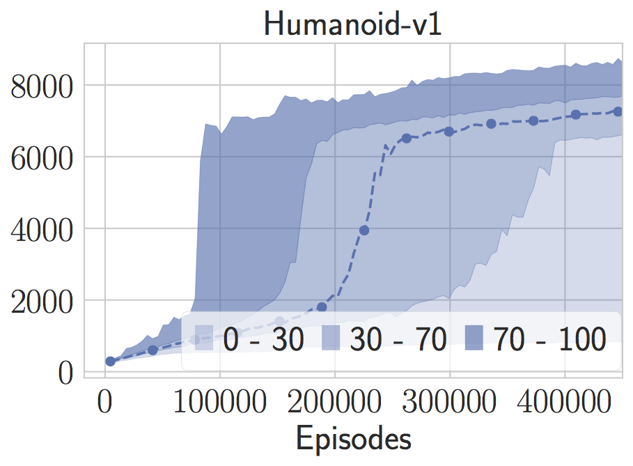 但是只有随机搜索还不够完美。Aurelia和Horia完全不能用人形模型做出有趣的事。试了很多次参数调整后,他们决定改进随机搜索,让它训练地更快。Horia注意到许多强化学习的论文利用状态的统计数据,并且在将状态传递给神经网络之前能够将状态白化。所以他开始保持在线估计状态,在将他们传递给线性控制器之前将它们白化。有了这个简单的窍门,Aurelia和Horia现在可以让人形机器人做出最佳表现。这实际上是Salimans等人在标准值上达到的“成功阈值”的两倍。只需要线性控制器、随机搜索和一个简单的技巧。