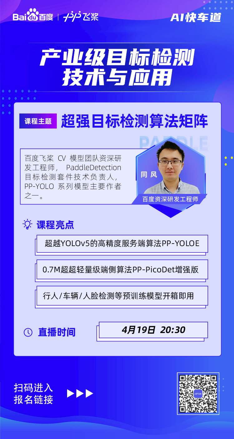为了让开发者们更深入的了解PaddleDetection这次的全新模型,解决落地应用难点,掌握产业实践的核心能力,飞桨团队精心准备了精品直播课!