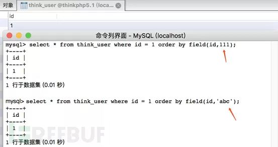 所以,我们要利用该漏洞,第一我们至少需要知道表中的一个字段名称,第二向field()函数中中传入两个字段。第二个字段不需要知道字段名,用数字或字符串绕过即可。