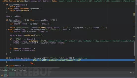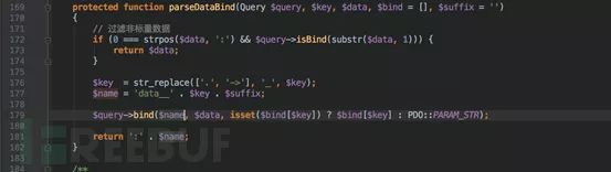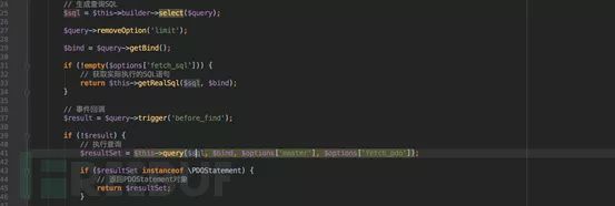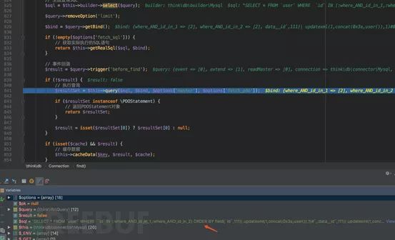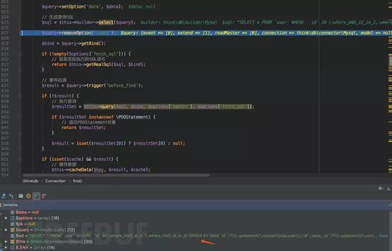 getOptions()函数是获取了当前要查询的参数,getFieldsBind()函数是获取数据表绑定信息,foreach循环是对$val值进行了处理,这里其实不是重点,就提一下。$val值是什么不用管,因为注入点在$key上,而$val 拼接在$key后面,可以在构造$key加#注释掉$val。