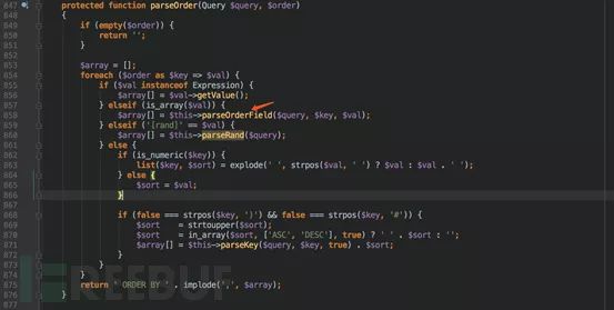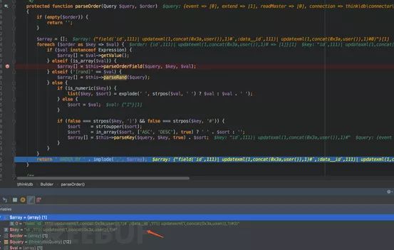 $val是个数组,进入parseOrderField()函数。F7下一步(我这里用的是phpstorm,F7是单步调试的意思)。