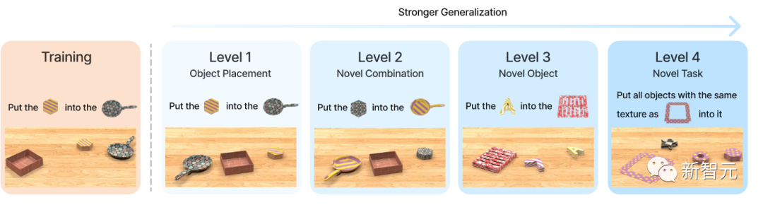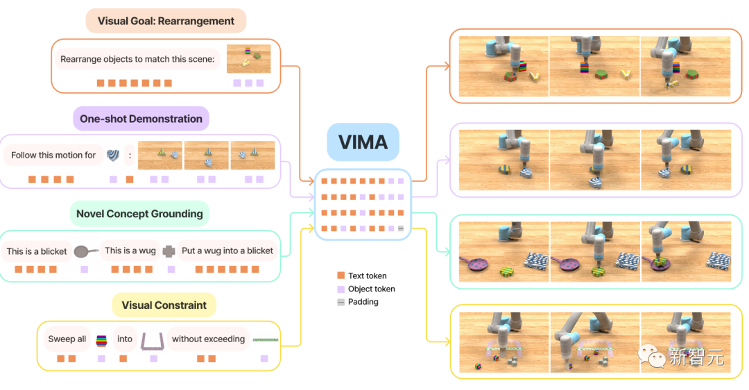 为了训练和评估VIMA,研究人员提出了一个新的模拟基准数据集,包含上千个由程序生成的带有多模态提示的桌面任务,和60多万条专家轨迹用于模仿学习,以四个等级来评估模型的泛化性能。