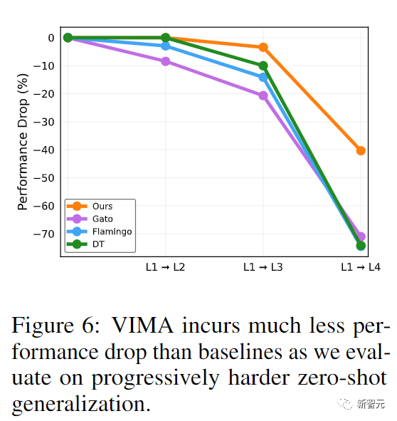 尽管Gato和Flamingo在更大尺寸的模型上性能有所提升,VIMA也仍然好于所有模型。