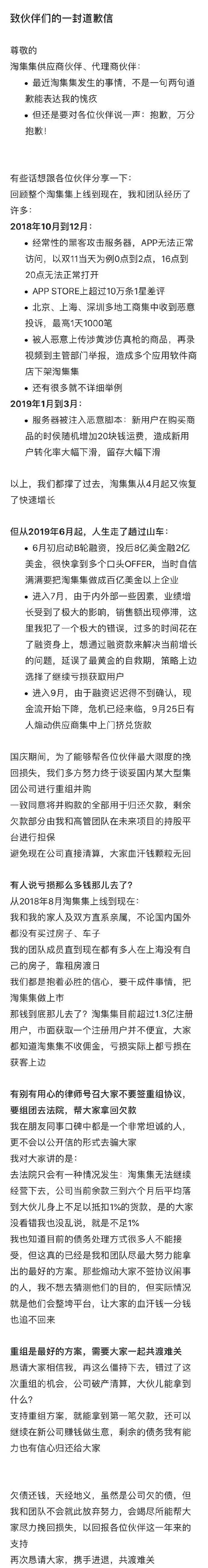 一味追逐用户增长的淘集集在资本的助推下变得贪婪和盲目,通过烧钱来暴力拉新,却轻视了供应链、用户留存、复购率、物流、成本缩减等关键元素。在道歉信中,张正平也承认自己过去沉迷于资本,想用融资来解决一切问题。