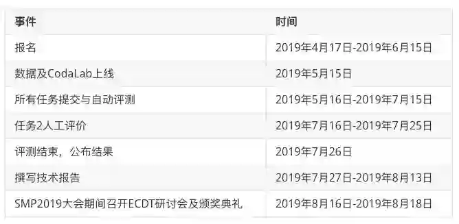 欢迎来到SMP2019中文人机对话技术评测(The Evaluation of Chinese Human-Computer Dialogue Technology,SMP2019-ECDT)。