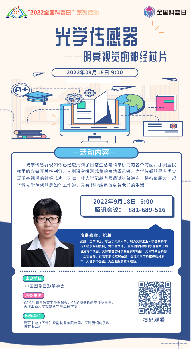 【2022全国科普日】“光学传感器--明亮视觉的神经芯片”讲座将于9月18日举办