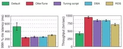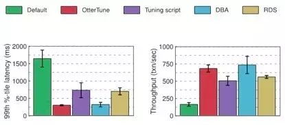 比较由OtterTune生成的最佳配置与其他工具的“优化脚本”、RDS生成的配置,OtterTune推荐的配置对MySQL数据库大约降低了60%的延迟,提升了22%到35%的吞吐量。OtterTune生成的配置几乎与DBA做的选择一样好。