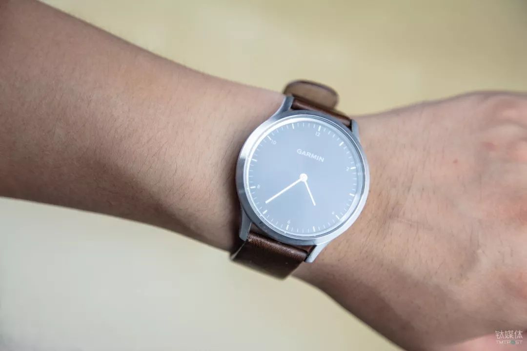 而佳明 vivomoveHR 可能是这之间最不像智能手表的智能手表了——单从外观上看,它和普通手表没有太大差别,其轻薄程度,会让人以为它就是一块普通的石英表。不过,表盘下半边屏幕暗藏玄机。用手轻触下方,你会发现佳明暗暗地将可触摸和显示电子信息的屏幕,放在了玻璃表盘之下。其智能功能都是围绕着这下半边屏幕实现的。