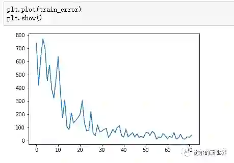 我们可以来看一下随着训练次数增加训练误差的变化趋势图。可以看到训练误差是在不断减小的,但是当中在不断的波动,这是因为我们的数据集比较小,而我们使用的batch_size也比较小,如果不同样本间差异比较大的话,很容易出现这种波动,同时训练学习率影响也非常大:
