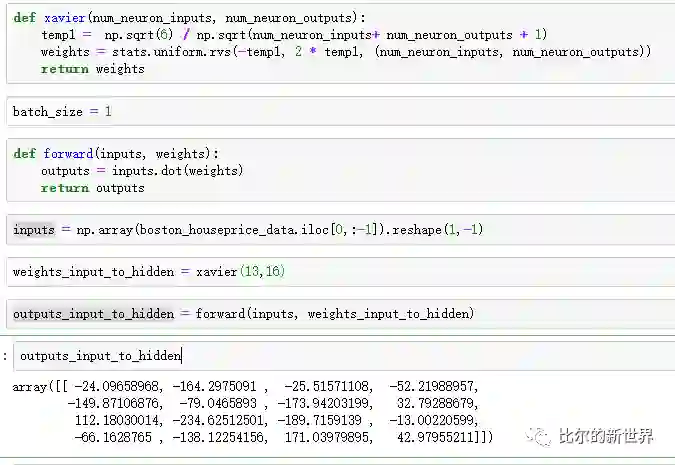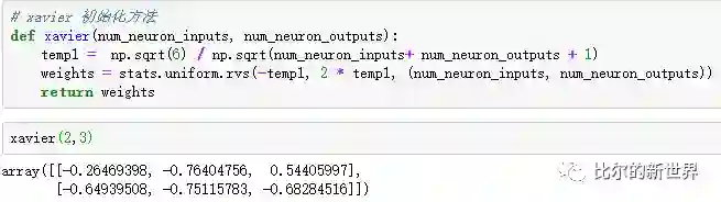 神经网络参数通过后向传播不断优化,使得模型预测值与真实值接近。一开始我们并不知道最优参数值,需要对参数进行随机初始化。对参数进行怎样的随机初始化其实也很有讲究,特别是对于深度神经网络。本文当中,我们使用xavier初始化方法,源自论文“Understanding the difficulty of training deep feedforward neuralnetworks”。假设我们输入层神经元为2,隐藏层神经元为3,则连接这两层之间的参数进行初始化代码如下: