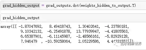 首先计算经过sigmoid后需要调整的梯度,这里直接将输出层需要调整的梯度点乘该全连接层的参数即可: