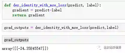 可以看到这样调整后预测结果就应该等于真实值,但是我们的步子一下不能迈这么大,因为当输入下一条不同的样本,这么调整预测效果可能就不好,所以后面调整的时候我们会有一个所谓学习率(lr, learning rate)的参数,这个参数控制权重调整的幅度。使用均方误差做损失函数来衡量误差,其梯度为2*(predict-label),常数项2通常省略,可以理解为将学习率调小了两倍。