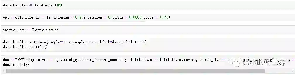 然后可以使用数据处理模块(DataHander),优化器模块(Optimizer),数据初始化模块(Initializer),网络搭建模块(DNNnet),批量读取数据并搭建深度神经网络: