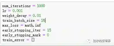 定义一些神经网络的参数,如迭代次数(num_iterations,学习次数),学习率(lr, 调节参数更新幅度),一次学习的数据大小(train_batch_size),还有一些早停参数(防止学习过猛), train_error用于记录每次学习误差: