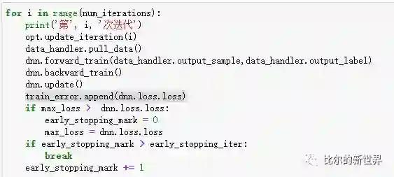接下来可以开始训练了,每次拉取一批数据data_handler.pull_data(),然后进行前向传播dnn.forward_train(),后向传播dnn.backward_train(),更新参数dnn.update(),记录训练误差train_error.append(dnn.loss.loss),这个过程反复很多次,直到训练误差连续15次都没有降低( 通过early_stopping_iter参数进行设置):