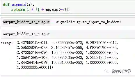 现在我们得到了第一个隐藏层的输入数据,接下来我们需要将该层每一个神经元的数据输入到激活函数得到隐藏层的输出。这里我们使用sigmoid激活函数,代码如下: