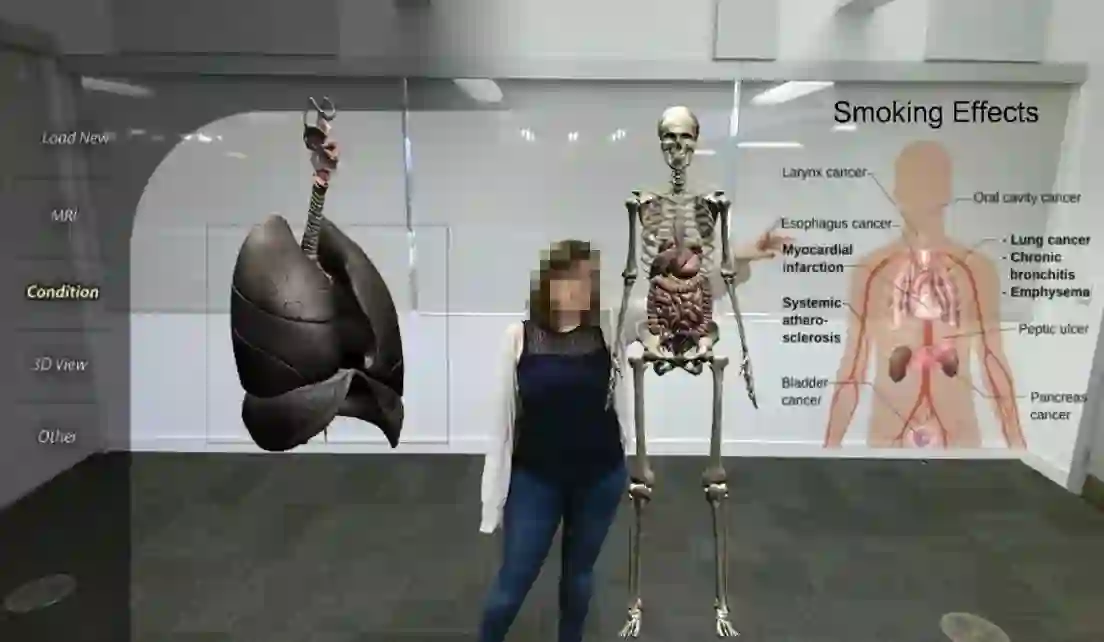 该系统允许用户使用手部动作和手势操纵,导航和演示患者数据,以便医生可以使用定制的3D虚拟模型来直观展示医疗程序和治疗效果。比如手术区域,治疗后的改善,或者烟草带来的伤害。