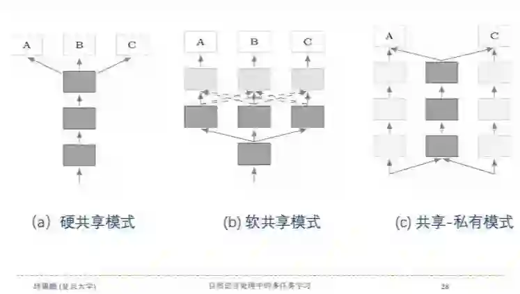 如下图所示,深度学习中的多任务学习模型结构主要分为三种:硬共享模式、软共享模式和共享-私有模式。