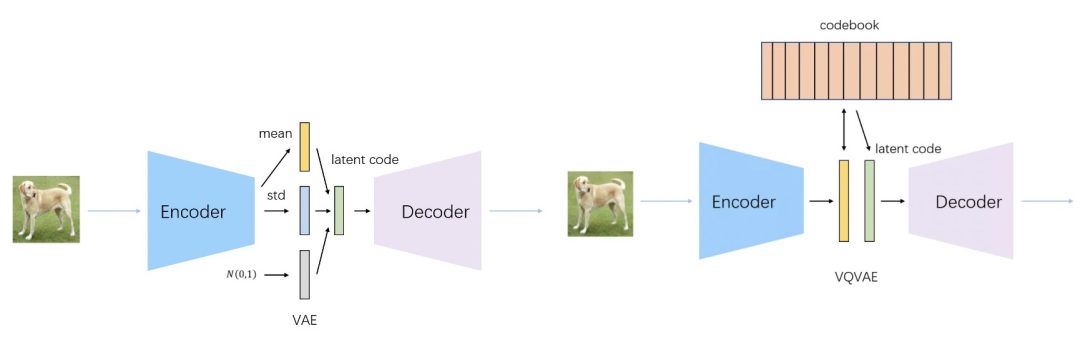 想实现在图像上应用MLM,一个前提条件是将图像转换成离散化的图像token。BEIT采用了Zero-Shot Text-to-Image Generation(2021)这篇文章中介绍的思路,利用dVAE将图像转换成token。这里简单介绍一下dVAE的原理。普通的VAE主要用于生成任务,采用类似于AutoEncoder的框架,利用Encoder将输入数据映射到0均值1方差的高斯分布,再从高斯分布中进行采样一个向量,将采用后的结果向量通过Decoder还原输入样本。这个过程中,Decoder就在学习一个从0均值1方差的高斯分布,到目标数据集分布的一个映射,因此非常适用于生成任务。而dVAE、VQVAE等方法,希望将输入数据映射成离散化的变量,因此将Encoder-Decoder之间的高斯分布替换成了从一个字典中的均匀分布。VAE和dVAE的区别可以参考下面图中的对比。